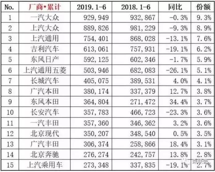 综合乘联会信息及相关媒体报道,2019年1至6月,国内狭义乘用车销售995.42万辆,同比负增长9.3%。从销量来看,大众、通用仍然是国内销量最高的汽车企业。同时,自主品牌普遍表现一般,日系车企销量整体稳中有升。其中2019年上半年销量最好的十大车企业绩又是如何呢?