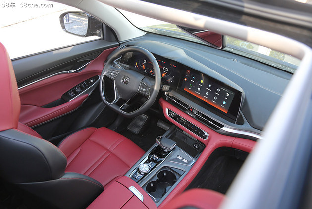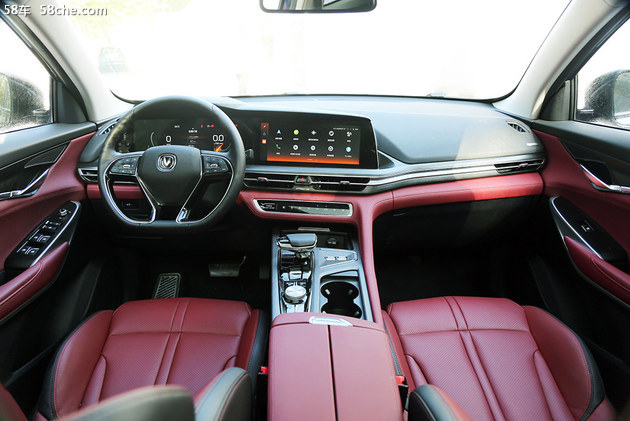 实拍的CS75PLUS采用的是红+黑的双色内饰,仪表台使用大量的软包+皮质材料包裹,高级感很强。另外,中控台的布局也在一定程度上向驾驶员倾斜,便于操作。