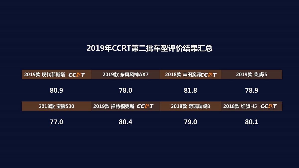今日,2019年度CCRT(中国汽车消费者研究及测试中心)第二批车型评价结果正式公布,本批次评价涵盖了紧凑型轿车、中大型轿车、小型SUV、紧凑型SUV、中大型SUV五类汽车的8款热门车型,从整体结果看,综合得分80分及以上车型共计4款(2019款 现代菲斯塔 (配置|询价)、2018款 丰田奕泽、2019款 福特福克斯、2018款 红旗H5 (配置|询价)),成为CCRT2019年度推荐车型,80分以下车型共计4款(2019款 东风风神AX7、2019款 荣威i5 (配置|询价)、2018款 宝骏530、2018款 奇瑞瑞虎)。