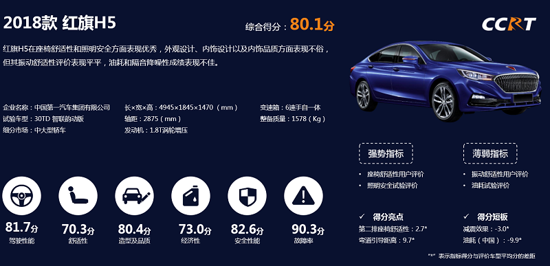 来自自主品牌的红旗H5,则得到了第4名的不错成绩,综合得分达到了80.1分。除去最高的故障率分值外,红旗H5的驾驶性能、造型及品质、安全性能均超过了80分,有着很均衡的表现。但红旗H5的舒适性与经济性则表现一般。