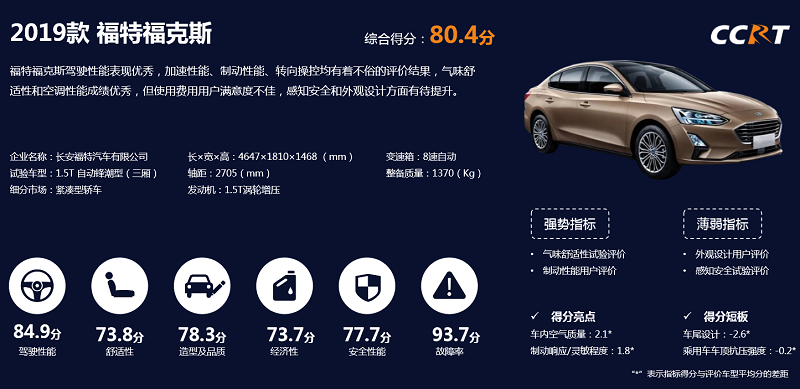 福特福克斯是8款车型中分值排名第三的车型,综合得分80.4分。除分值较高的故障率外,福克斯只有驾驶性能超过了80分,并且达到了不错的成绩,这也主要归功于它运动化底盘的调校,与较强的动力。此外,在舒适性、经济性的表现上不太理想;造型及品质、安全性能则是中规中矩的表现。