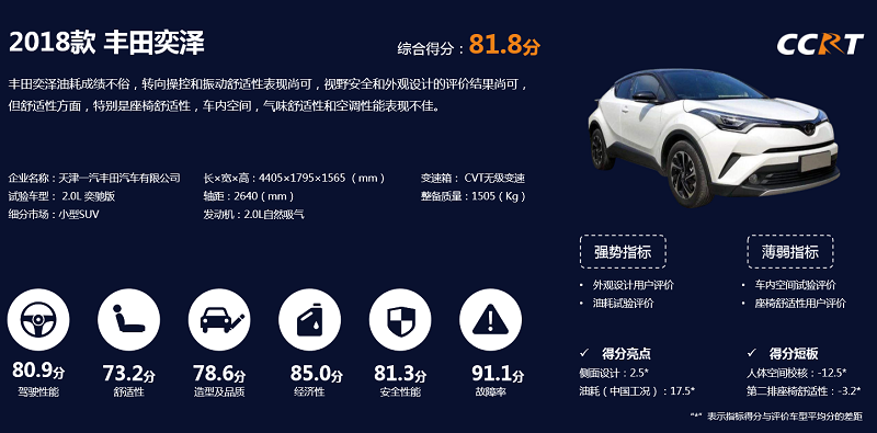 丰田奕泽为此次评分最高车型,综合得分为81.8分。除最高的故障率外,丰田奕泽的经济性、安全性能、驾驶性能都得到了高于80分的分值。其中经济性来源于热效率高达40%的发动机;安全性能则要归功于丰田的Toyota Safety Sense智行安全系统;TNGA架构为奕泽带来的低重心也让其有着不错的驾驶性能。值得一提的是,奕泽的舒适性并不理想,这也主要取决于它不大的车内空间。