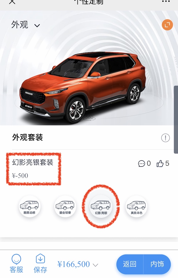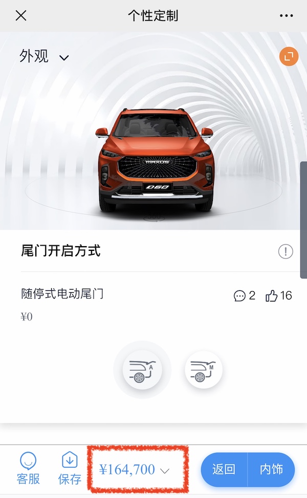 可以看到D60(参数|图片)的座椅有5、6、7座的布局可以选择,6座可以说是时下最好的选择了,能够保证每个人都有很舒适的独立的座位,也不用额外加价,如果是常规的5座则是减少3千元。颜色、前脸造型、轮胎尺寸与外观的套装我们均以厂家主打的为基准去选择,此时可以看到价格为164700。至于D60的亮点“离骚”模式迎宾灯,我们选择了卤素光源+LED组合和无级的随停电动尾门,至此价格都没有变化。