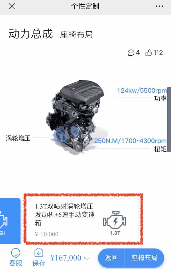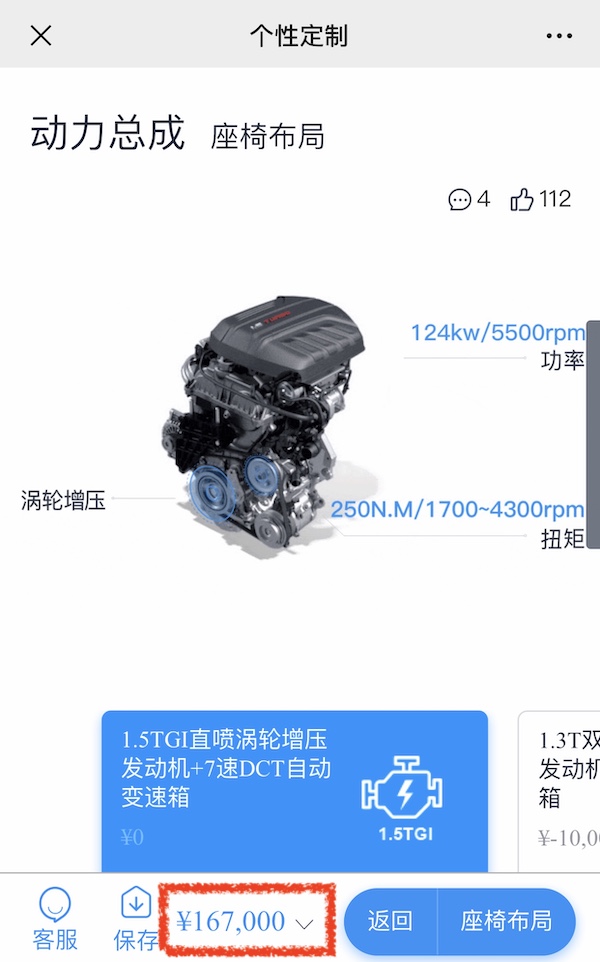 当我们打开蜘蛛智选的时候,其实厂家已经默认帮我们选了好一些主流的配置,我们可以看到价格这时候是167000元,动力为1.5T版本,其实我们只需要根据自己的需求做一个加减法的选择,如果你选择1.3T的动力则是在此价格的基础上减掉了一万块,下面我们都以1.5T动力为标准做一个导购。