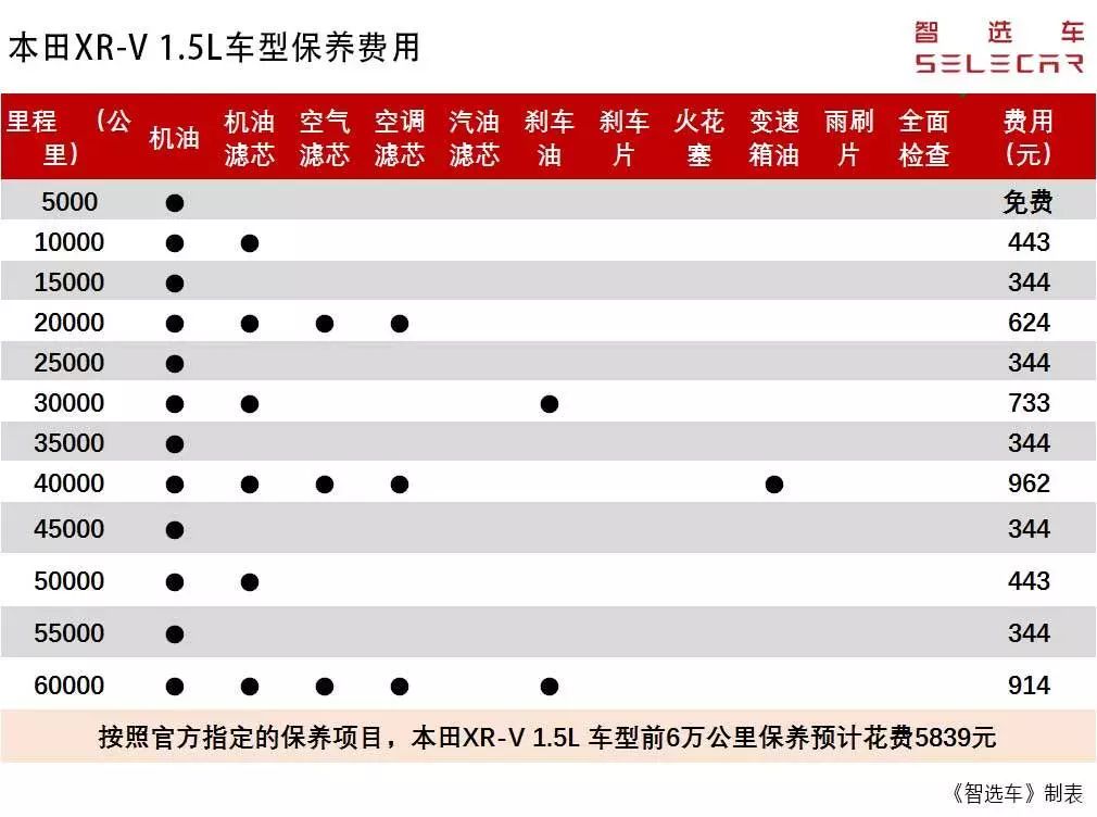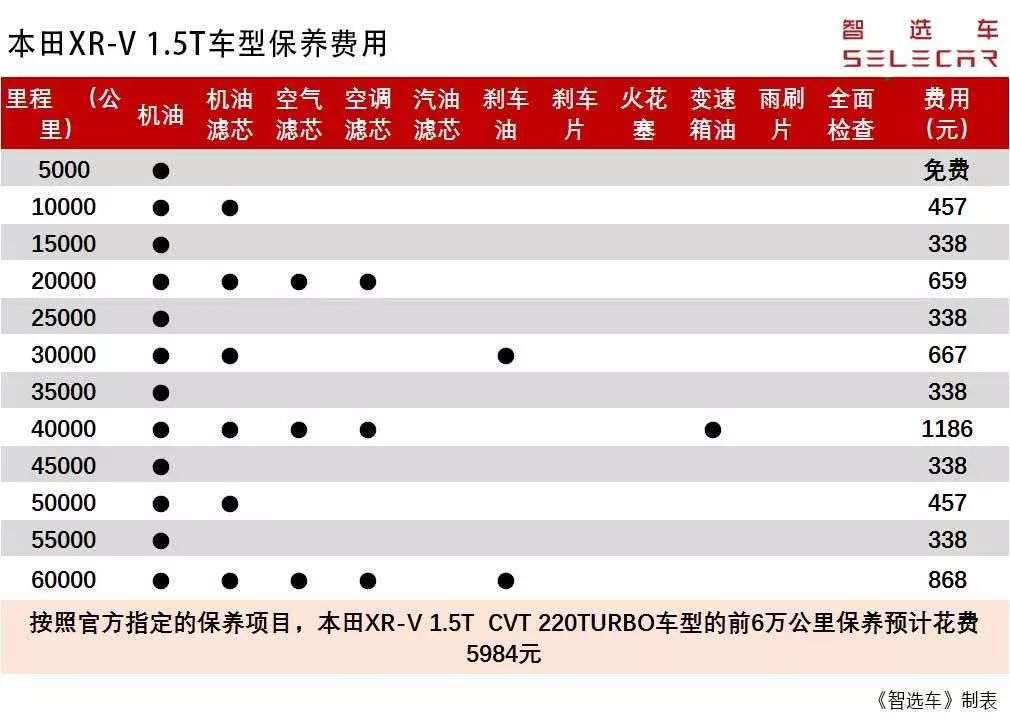 而再看XR-V的1.5T车型保养费用,从官方保养项目来看,和1.5L车型的保养间隔,保养项目几乎一模一样。唯一不同的就是费用,1.5T车型前6万公里的保养费用为5984元,仅仅比1.5L车型贵了145元。