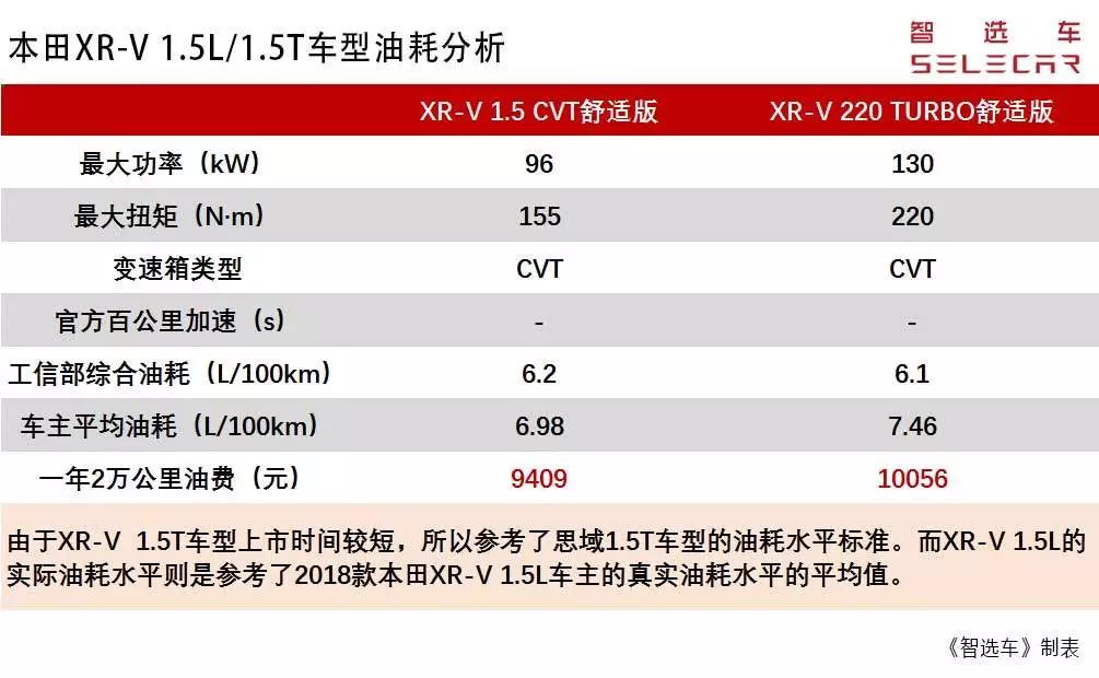 同时通过上面表格对比,综合判断,XR-V 1.5L车型与1.5T车型两者一年的油耗费用差距约为647元,差距小于1000元,这样的油耗差距并不大。