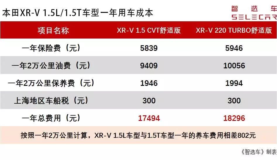 根据上表分析,可以看出本田XR-V 1.5T车型相比1.5L车型,两者一年的养车费用相差802元,相差并不大。另外无论是自吸还是涡轮增压,本田XR-V的养车成本在同级别中还是属于较低的。