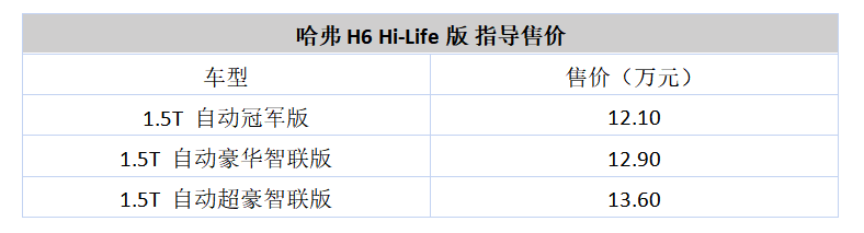 哈弗H6 Hi-Life版共推出了3款车型,售价区间为12.10-13.60万元。此外,购车用户可享受现金优惠5000元、置换补贴4000元、金融贴息9000元、基础服务终身免费、娱乐服务三年免费、尊享服务三年免费等政策。