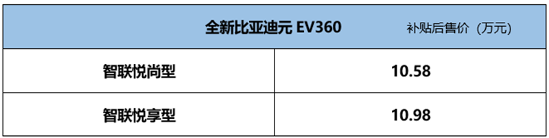 2019款比亚迪元EV360车型再迎改款,新车共推出两款配置,分为智联悦尚型和智联悦享型,补贴后的全国统一售价区间为10.58万-10.98万元。