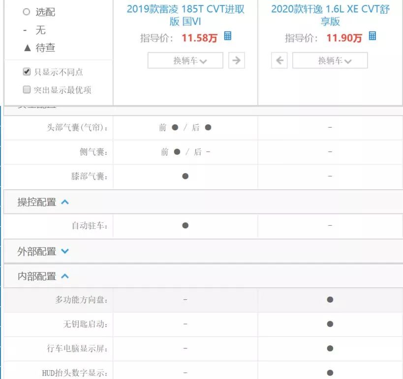 配置方面,雷凌入门车型相比轩逸,安全配置更加丰富,后排座椅也支持放倒,全系标配LED大灯,但同时少了多功能方向盘、无钥匙启动、HUD抬头显示等几项功能。如果是我选择,仅考虑入门车型配置,还是雷凌更加实用。