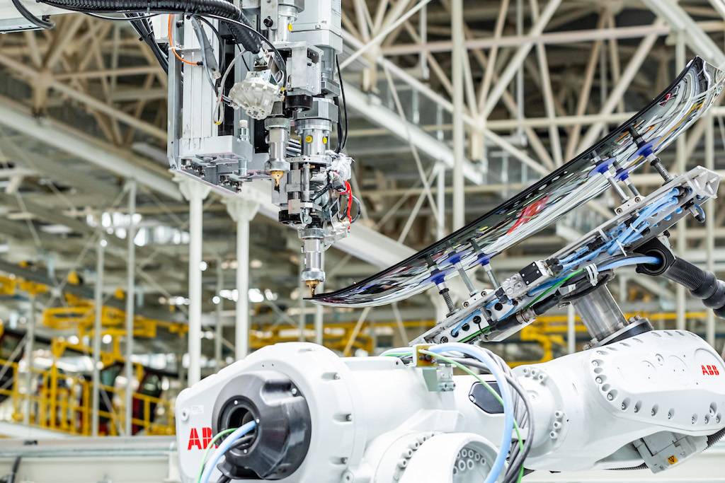 总装车间内配备了世界先进的ABB涂胶机器人,它的作用是对车辆的前后风挡玻璃进行涂胶,从风挡玻璃上料到安装都采用了高自动化设备,它可以实现自动清洗,这样有效地提高了胶型质量,也是为在工厂里工作的员工提供了一个整洁、健康的工作环境。
