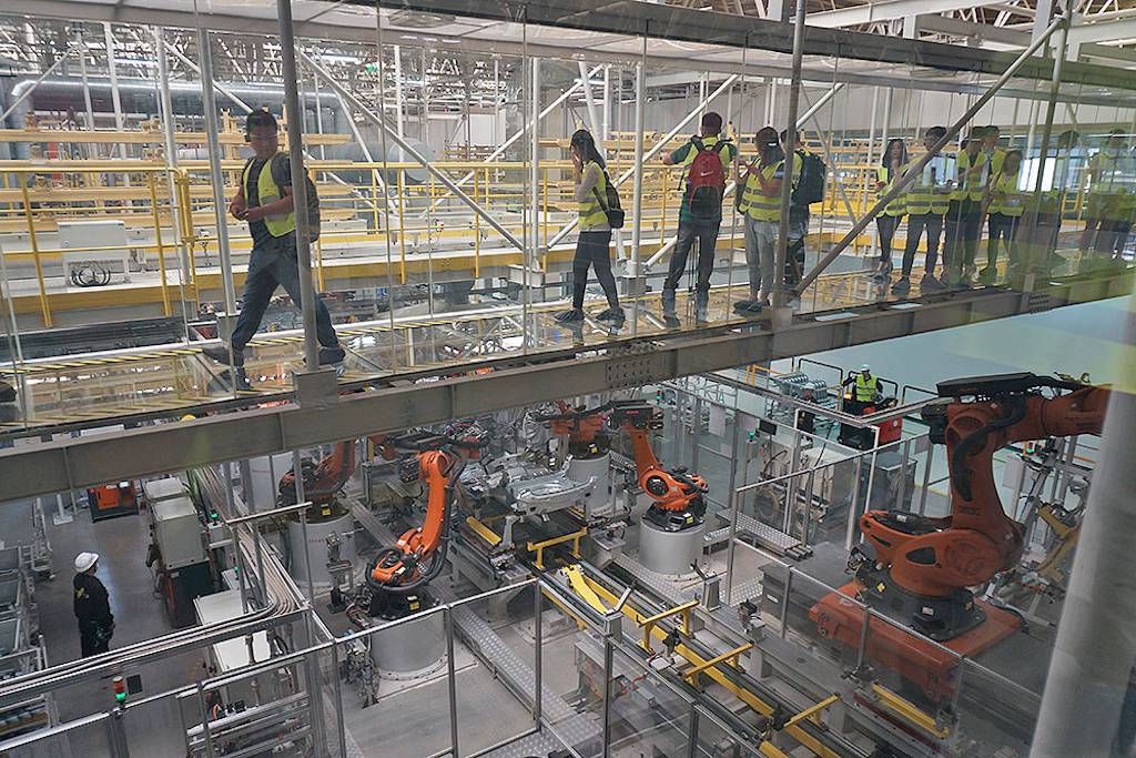 除了激光焊接技术,焊装车间还有一个“特色景点—玻璃栈道”,官方名称叫“焊装车间空中通道”。这条通道全长70米,离地高度在5米左右,呈C型布局,在通道中可以完全的看到KUKA机器人是怎样将车辆的三大件进行拼装的过程。