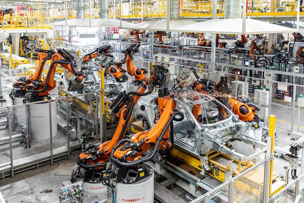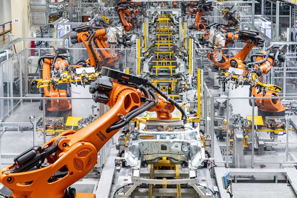 工厂建有冲压、焊装、涂装和总装四大车间,此次我们参观的是焊装和总装两个车间。焊装车间占地面积约48000平方米,可以说是整个领克张家口工厂里最智能化的车间之一,引入了世界顶级的KUKA柔性生产线,采用了285台KUKA机器人,主焊线自动化程度达100%。