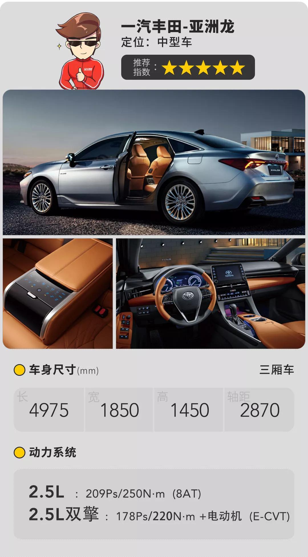 配置上亚洲龙全系标配了LED大灯、自适应巡航、七个安全气囊和9英寸中控屏幕等,使得低配车型的性价比也很突出。动力上采用的是2.5L自然吸气发动机搭配8挡手自一体变速箱,最大扭矩为250牛米,此外还有教授极为推荐的双擎混动版本,动力更强并且可以达到4.3L的超低油耗。