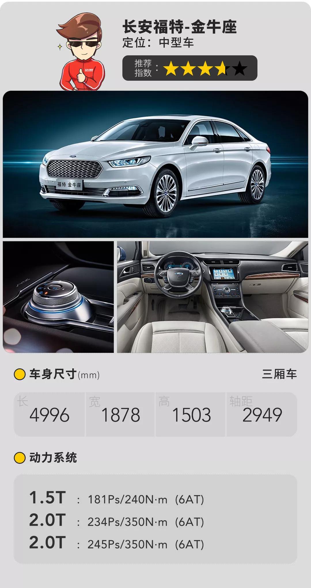 金牛座全系标配了主/副驾驶电动调节和前排座椅加热功能,配合8英寸中控屏和旋钮式换挡键机构使得低配车型也有很强的豪华感。虽然其守旧的内饰不能成为卖点,但宽适的后排空间一定能吸引你为它买单。