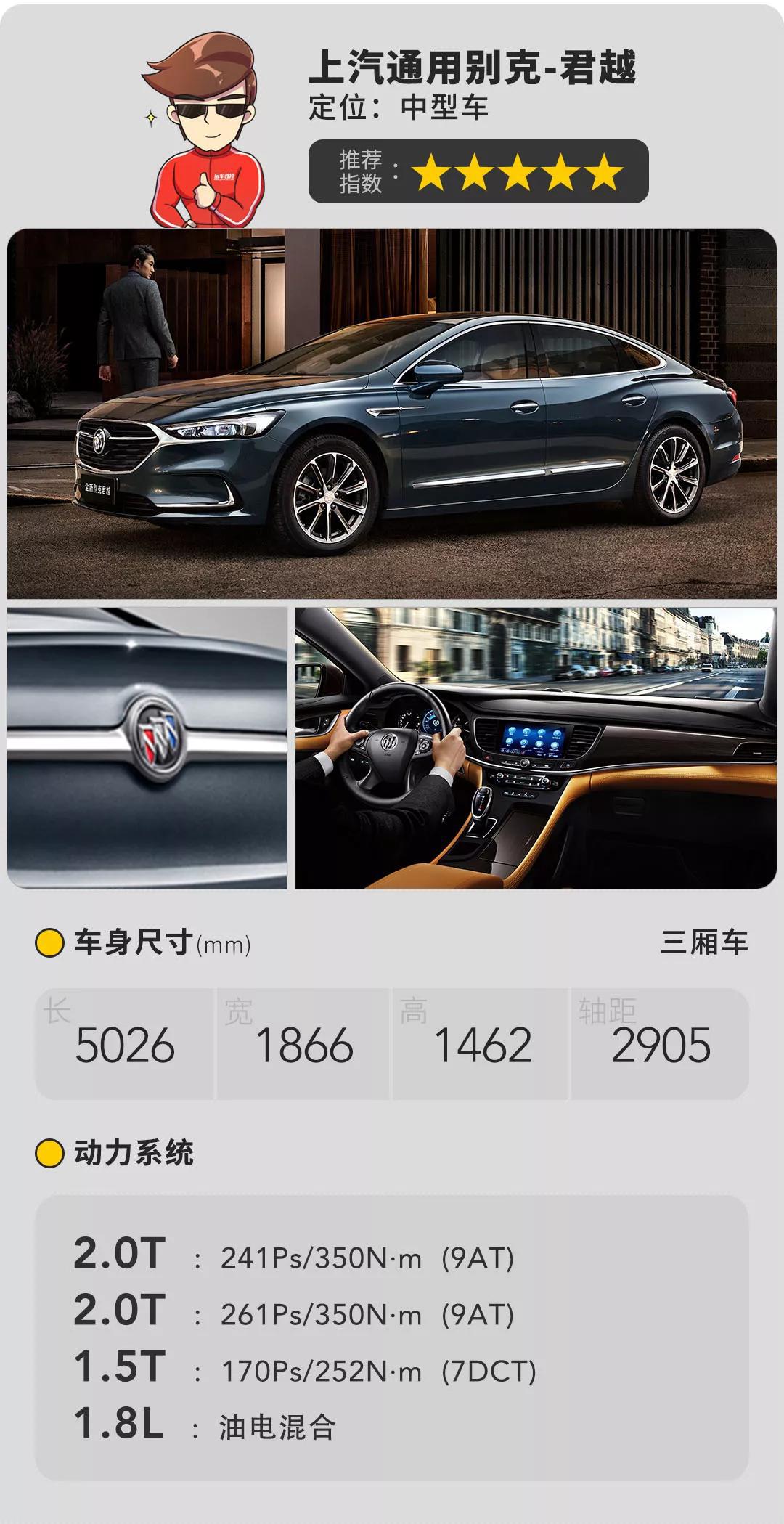 君越的身板绝对称得上“越级”,车声长度直接怼到了5.02米,轴距2.9米,别克要是脸皮厚一点,怕是要把它定位为中大型车。不过车身虽长,后排空间只是中型车的平均水平,好在使用了大量真皮用料的环抱式座舱扳回了几分优势。