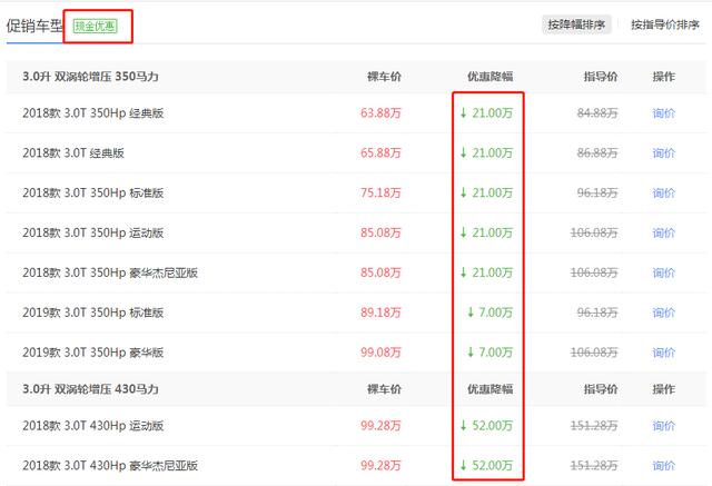 而旗下的车型更是价格暴跌,再加上并没有升级国六排放标准,旗下的国五车型全面处于清仓状态。比如我们今天的主角,玛莎拉蒂首款SUV车型Levante就是一个靠降价清仓的典型例子,以汽车之家某玛莎拉蒂北京经销商给出的优惠报价来看,18款入门版的Levante降幅在21万元左右,入门版价格仅为63.88万元,优惠金额已经能买到一台雅阁了。而18顶配车型更是降价52万进行甩卖,跌破百万大关仅为99.28万元,优惠金额已经达到了一台霸道的水平。而且备注的还是现金优惠,力度相当给力。