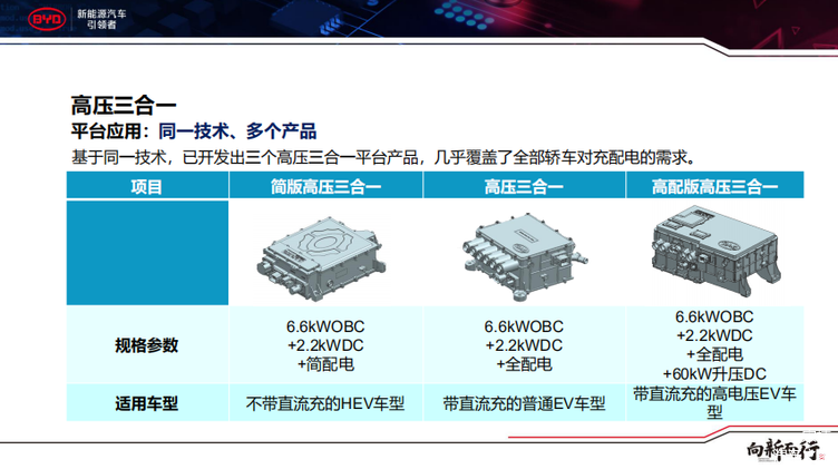 2018-2019年,比亚迪先后推出基于“e平台”技术牵引而来的e1(45千瓦级)、元EV535(70-120千瓦级)、秦Pro EV(100-135千瓦)、宋Pro EV(180千瓦级)、唐EV四驱(2x180千瓦级)不同级别的电动汽车。