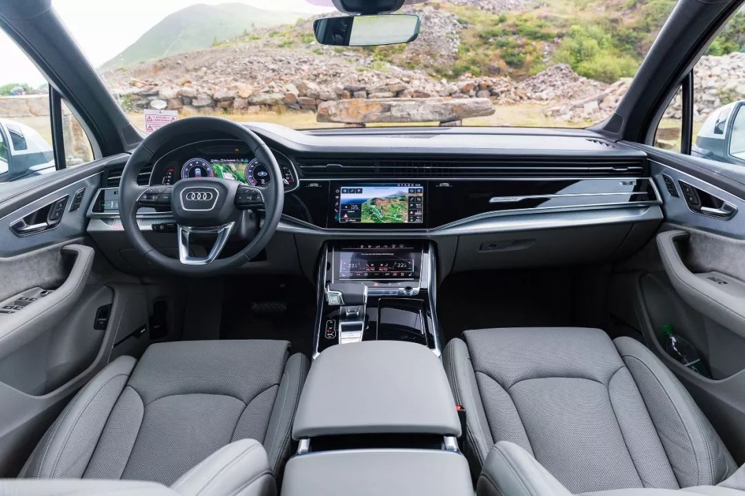 新Q7的内饰氛围有了长足的提升,奥迪把科技感提高到一个新高度。仪表盘位置使用了一块12.3英寸的虚拟座舱液晶屏,中控则是两块大尺寸的高清触控屏,它们分别显示不同的价值信息。除了显示效果细腻,当车上人员点击触屏时,会接收到来自屏幕的触觉和声觉反馈,适合开车时进行盲操作。
