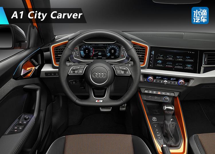 中控台向驾驶员倾斜,仪表台左右两侧的对称出风口具有非常强的驾驶专属感。S-Line版本车型可选布料、合成皮革、Alcantara 、合成皮革等多种内饰材质。A1 City Carver标配全数字仪表盘,中控触摸显示屏尺寸为10.1英寸,内置最新MMI人机交互系统,带有导航,在线交通信息,停车信息,混合收音机和Wi-Fi热点等功能。值得一提的是,该车还配有560W功率的B&O音响。