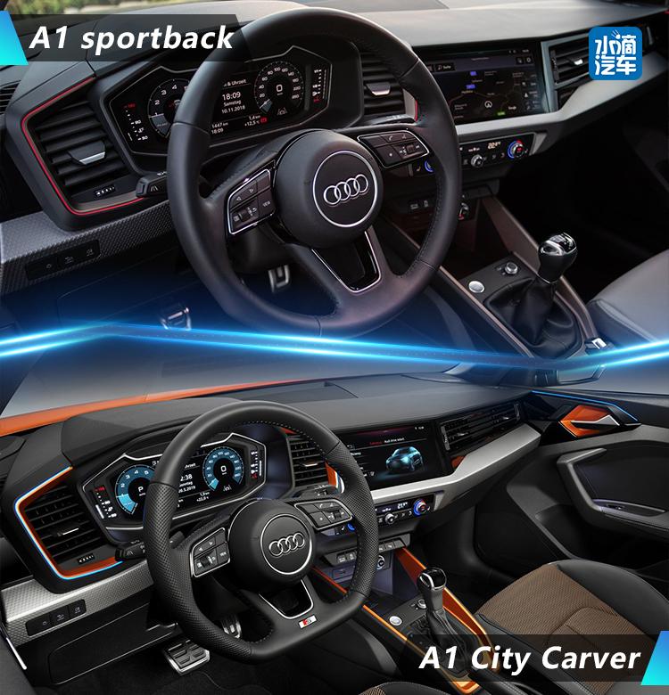 内饰部分,A1 City Carver与A1 sportback造型并无明显差别,依旧是那个大量运用几何形状的内饰,复杂的造型很容易让人联想到电影中未来战舰的座舱。与车身同色的内饰点缀为刚硬的内饰带来了一丝生机,很讨年轻人喜欢。