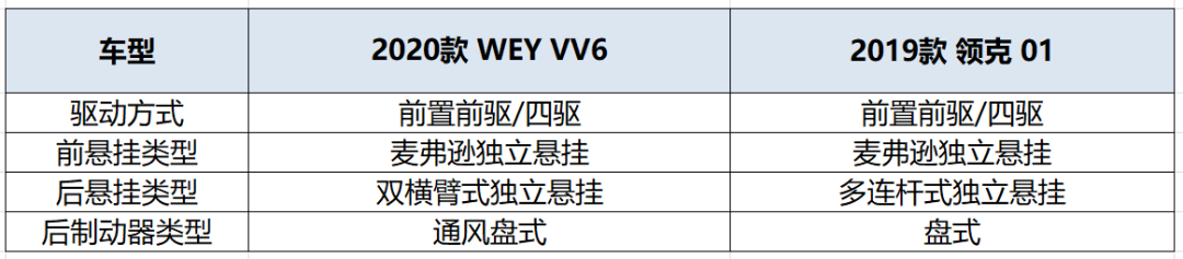 两款车型都有两驱和四驱的版本供消费者选择,且两车的前悬挂均采用了麦弗逊式独立悬挂。不同的是VV6 搭载的后悬挂是双横臂式独立悬挂,更注重于操控性,而领克01搭载的是多连杆式独立悬挂,底盘调教更偏向舒适。