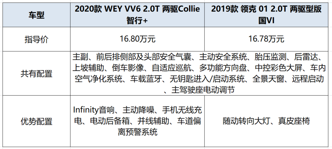 20万能买什么车呢?20万落地价的SUV,相信很多人第一时间想到的是普通合资品牌的SUV,例如本田CR-V、丰田RAV4 荣放 (配置|询价)等等。虽然这些车主流、口碑好,但是始终是普通品牌的车型,你有想过豪华品牌的SUV吗?近年来自主品牌的发展越来越好,得到了越来越多消费者的认可,所以各自主品牌针对追求品质的消费者相继推出了各自的豪华品牌。20万开豪华品牌SUV不再是天方夜谭。今天小编就为大家带来两款自主豪华品牌的明星车型的对比——2020款 WEY VV6 vs 2019款 领克 01 。