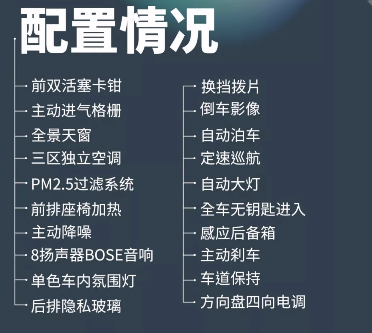 而感应式的电动后备箱、第三排座椅的电动翻折、无钥匙的进入和启动、全景天窗、三区独立空调、方向盘电动调节、主动降噪、后排独立空调、8扬声器的BOSE音响系统等配置也为消费者提供了更加舒适的用车体验。