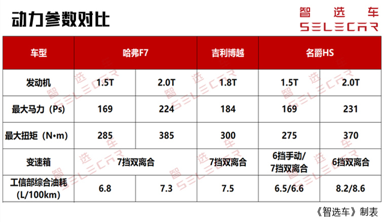 通过对比来看,哈弗F7与名爵HS都分别提供1.5T和2.0T两种动力,且动力形式与数据表现都较为不错,而吉利博越仅提供1.8T一种动力。
