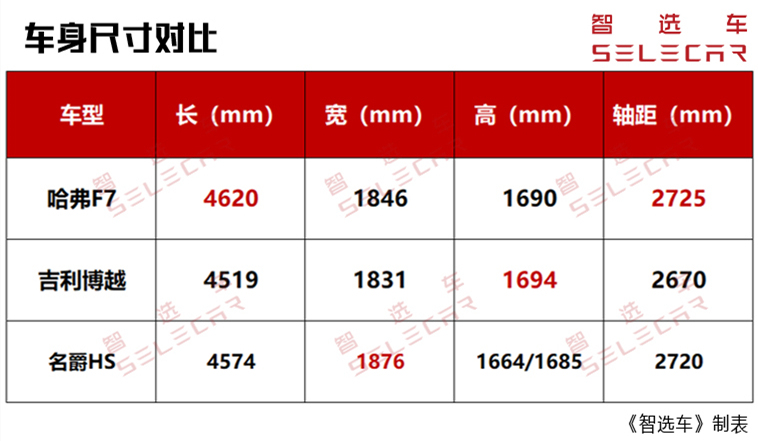 车身尺寸部分,哈弗F7的长宽高分别为4620/1846/1690mm,轴距为2725mm。吉利博越的长宽高分别为4519/1831/1694mm,轴距为2670mm。而名爵HS的长宽高分别为4574/1876/1664(1685)mm,轴距为2720mm。相比较而言,哈弗F7在长度以及轴距方面都占据优势。此外,厚实的座椅、较为平整的后排地台也使得哈弗F7具备不错的驾乘舒适性。