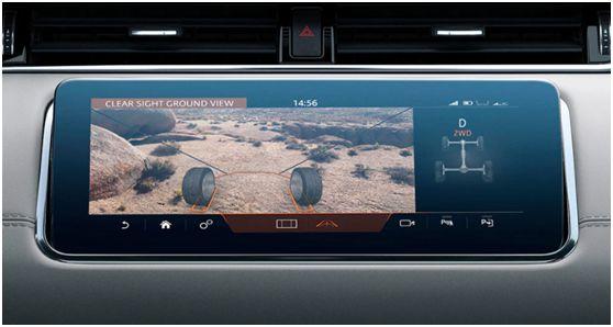 新一代揽胜极光首次采用了ClearSight GrandView(全地形“透视”)技术。它是通过车辆前进气格栅中央的一颗摄像头和外后视镜下沿的两颗高清广角摄像头拍摄,然后将车前180°的盲区视野画面集成在中控屏上,大大提高了行驶的安全性。