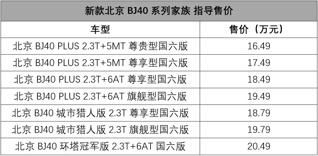 至于动力,国六版本的BJ40都搭载了2.3T发动机,其中环塔冠军版和城市猎人版匹配的是6AT变速箱,BJ40 PLUS版除了6AT之外,还提供5MT变速箱选择。参数部分,手动挡车型的最大马力是211匹,自动挡车型的最大马力为231匹。
