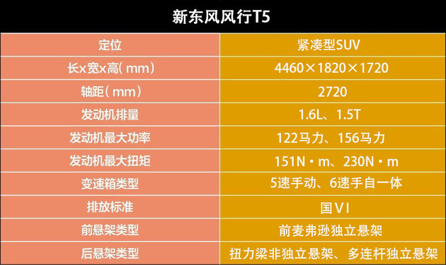 新风行T5提供1.6L和1.5T两款发动机可供消费者选择,并且符合国六排放标准。其中1.6L发动机的最大功率为90kW(122Ps)/6000rpm,最大扭矩151N·m/4000rpm,匹配的是5速手动变速箱; 1.5T发动机的最大功率为115kW(156Ps)/5000rpm,最大扭矩230N·m/1750-4600rpm,匹配的是6速手自一体变速箱。