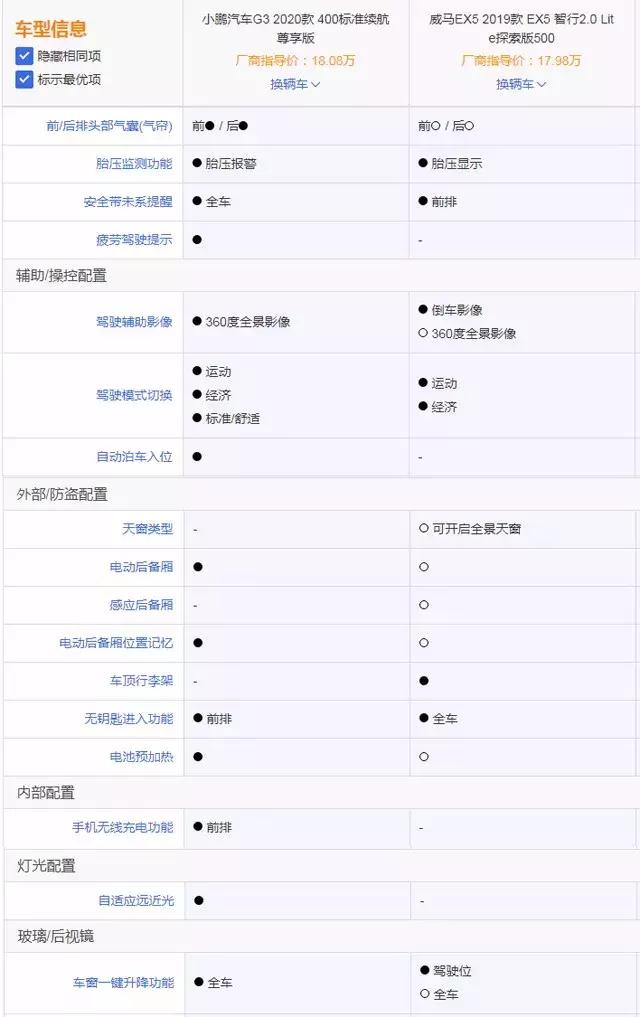 同价位车型小鹏G3与威马EX5相对比,配置上威马EX5就显得比较吝啬,像前排头部气囊、360全景影像等安全配置都是选装,有点不太厚道,18万的车型还是4喇叭配置,电池预加热还是选装,难怪不少车主表示自己车辆冬季续航会大打折扣。