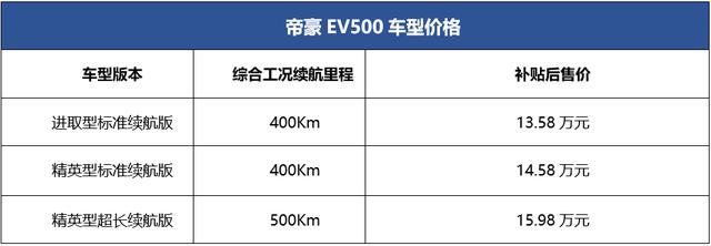 在用车成本方面,以帝豪EV500精英型超长续航版为例,其综合工况下百公里电耗低至13 kW·h,达到同级最佳的水准,按照北京居民用电价格,每公里电费低至7分钱,极大地降低了运营成本。