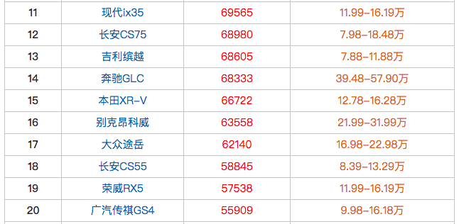 从销量第11名开始到第17名,销量都集中在6万辆左右。从中我们也能够发现,SUV市场的竞争确实十分激烈。现代ix35 (配置|询价),长安CS75,吉利缤越,奔驰GLC,本田XR-V,别克昂科威,大众途岳的销量都非常的接近。不过这几款车型的级别却相差得非常多。有自主品牌,有合资品牌,有小型SUV,还有中型SUV。