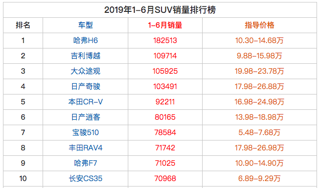 销量排名第一的依然是哈弗H6 (配置|询价),2019年上半年的销量高达18万辆,领先第2名8万辆之多。哈弗H6在中国已经成为了一款现象级的车型,甚至很多人说它的热销有些不太合理。