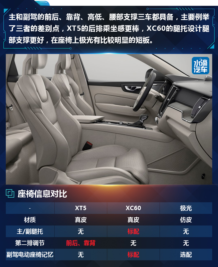 这三款车都有各自的特点和独门绝技,比如XT5搭载了通用最新的可变缸发动机,XC60拥有这个级别少见的空气悬挂、极光在科技感的营造上独步天下。本期水滴汽车导购选择了这三款车40万价位的车型,基本上是各家的次顶配款式,做一个全方面的比较,看看三者之间的优劣,应该如何选车。