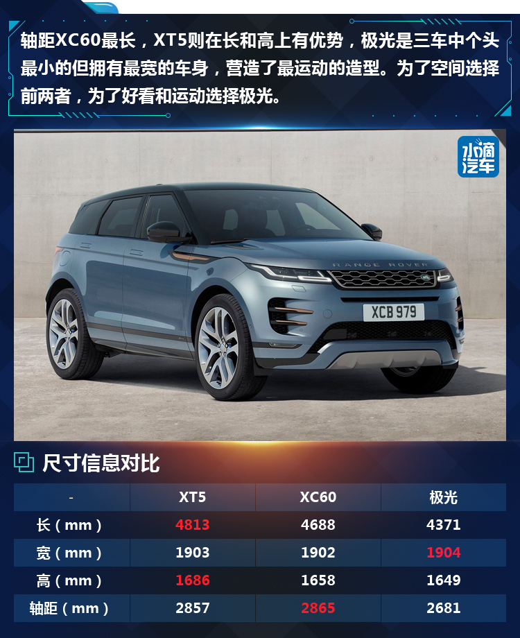 外观而言,三款车也是继承了各自家族化的特征,XT5有泪眼大灯、钻石切割车身,整体造型更显硬朗和刚正,XC60有雷神之锤大灯和维京之斧尾灯,整体造型修长柔和,极光基本保留了上一代的特点,整体造型浑然一体、圆润中蕴含方正、运动感前沿设计感最强。