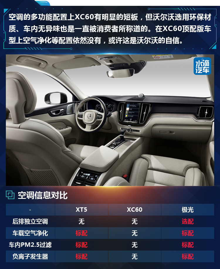 具体来看,方向盘加热XT5是标配,而其他两款车型只能选装,XT5方向盘带有记忆功能还是电动调节,其他两车没有,但XC60和极光有全液晶仪表盘,XT5没有。
