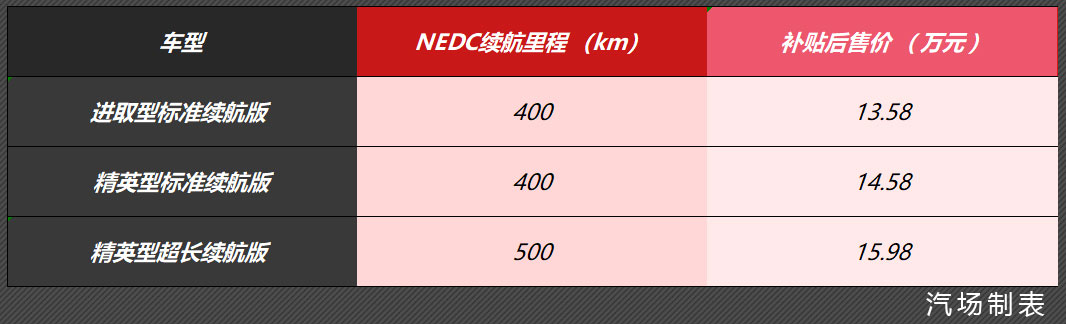 新车推出电池容量为61.9kWh和51.9kWh两种版本,分别对应的NEDC续航里程为500km和400km,官方称该车的能耗水平可达13kWh/100km。