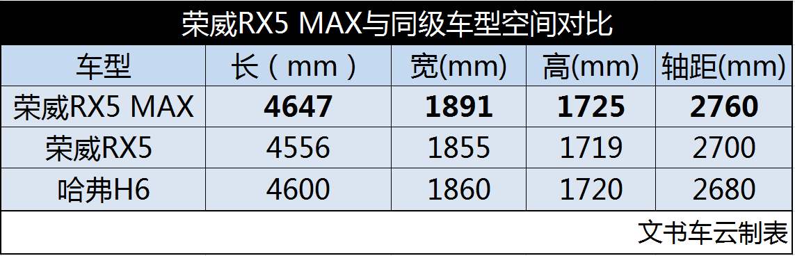 车身尺寸方面,荣威RX5 MAX长宽高分别为4,647/1,891/1,725mm,轴距为2,760mm,相比荣威RX5来说,分别加长了91mm、加宽了36mm、加高了6mm,轴距则是加长了60mm,整体要比荣威RX5来说大了一圈,甚至比行业标杆哈弗H6的尺寸也明显超过,由此也可以判断,荣威RX5 MAX的定位也比荣威RX5要高上一个级别,已经是一款接近中型SUV的尺寸了。