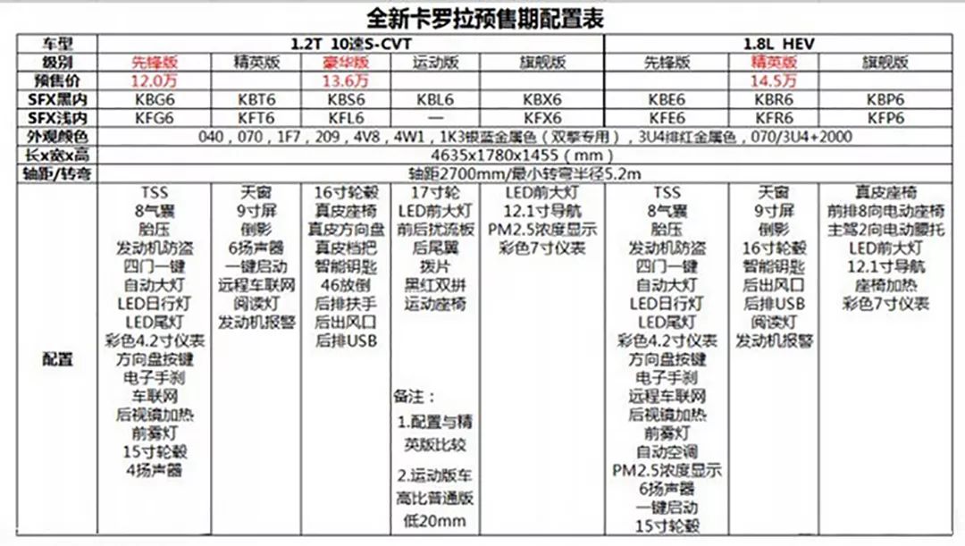 网传卡罗拉各车型配置丰田第十二代卡罗拉将于8月9日正式上市,此前新车已公布预售价格:12.00-14.50万元 。全新卡罗拉和姊妹车型雷凌均基于TNGA架构打造,新车从外观到内饰配置均与现款车型产生较大差异。日前,其配置信息在网上提前曝光。从网上曝光的信息来看,新车全系标配8个安全气囊、ABS+EBD+BA+TRC+VSC+HAC、电子驻车、胎压监测、发动机防盗、倒车影像,值得注意丰田TSS智行安全系统也将全系标配。顶配车型还将配备12.1英寸显示屏。至于动力方面,新车将提供1.2T以及1.8L混动系统两种动力系统。全新卡罗拉脱胎换骨,配置极其丰富,标配8气囊和TSS系统是主打卖点,相比同级对手优势十分明显,新车即将到来,最终售价非常令人期待。