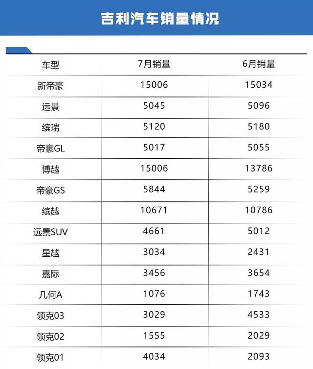 在吉利的产品中,销量王还是帝豪和博越 (配置|询价),两款车的7月销量均为15006辆。不得不说,新帝豪和博越的月销量长期保持在一万辆以上。其中,新帝豪一方面其性价比确实高,另一方面在共享汽车领域的贡献大。