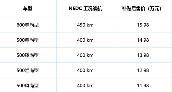 对于纯电车型来说大家最关心的还是续航问题,这款吉利帝豪GSe长长长续航版凭借400~450km的NEDC续航里程,拔高了它的产品力下限:追求性价比的消费者,可以选择续航400km的500车型;而追求续航里程和配置的消费者,则可以选择续航450km的600车型,毕竟15万左右这个价位,已经没有哪款车可以达到450km的续航了。