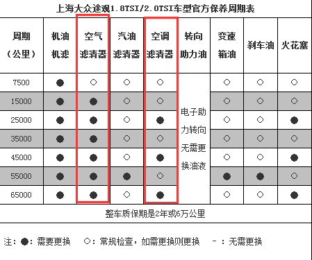 例如按照保养手册的建议,上海大众途观 (配置|询价)的空气滤芯除首次更换周期为1.5万公里外,其余均是1万公里的更换周期,空调的保养周期则为2.5万公里。