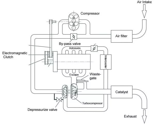 在转速较低时,机械增压旁通阀是关闭的。机械增压正常工作。进气流经过机械增压后,再经过涡轮,然后进入进气歧管。
