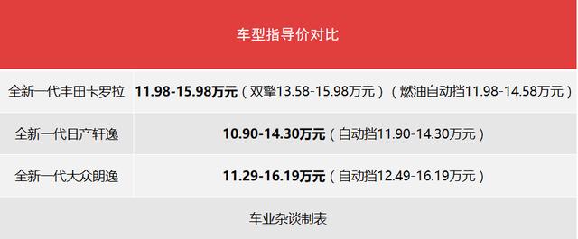 单纯以售价区间来说,10.90-14.30万元轩逸在三款车型当中最亲民,卡罗拉则最贵。不过由于目前新卡罗拉全系标配自动挡,并且所售车型中包含双擎混动版,售价较高也在情理之中。
