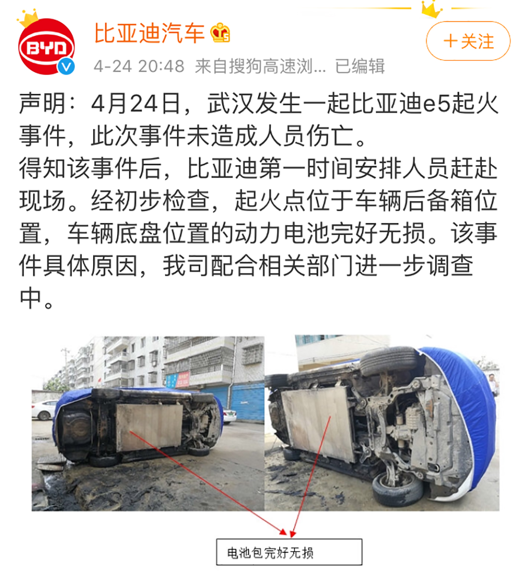 再者,以比亚迪自燃事件为例,根据比亚迪方面做出的回应:起火点位于车辆后备箱位置,车辆底盘位置的动力电池完好无损,足以证明现在头部新能源车企对于电池的保护已经达到相当不俗的水准,所以电动车易燃易爆炸的观点并不成立。