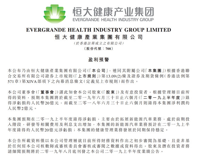 近日,在半年财报公布之前,恒大健康率先在港交所发布盈利预警公告。恒大健康预期,2019年上半年度录得净亏损约20亿元人民币,主要原因是“拓展新能源汽车业务,处于前期投入阶段,研发等相关费用及利息支出增加”。根据公告内容,新能源汽车业务预计上半年净亏损约20亿元人民币,去年同期恒大健康净利润约人民币2亿元。